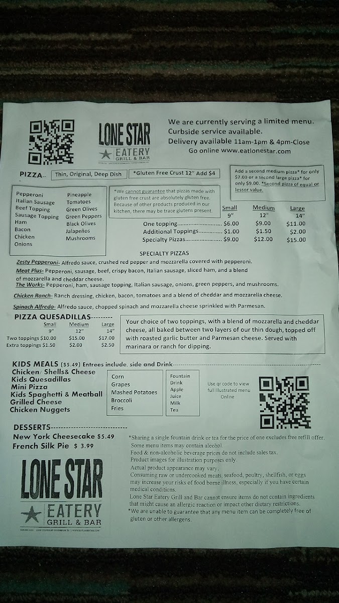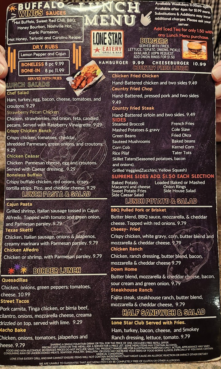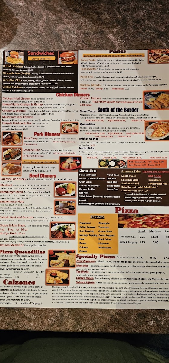 Overall, the food and drink choices at Lone Star Eatery reflect a comfortable, no-fuss experience where portion sizes are generous and the familiar flavors help guests settle in for a satisfying meal. The easy-going setting makes it a convenient stop for both locals and visitors looking for straightforward, enjoyable eats.